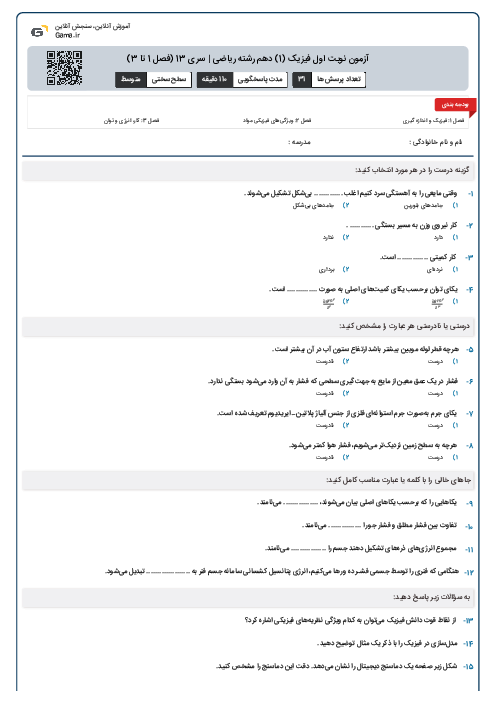 آزمون نوبت اول فیزیک (1) دهم رشته رياضی | سری 13 (فصل 1 تا 3)