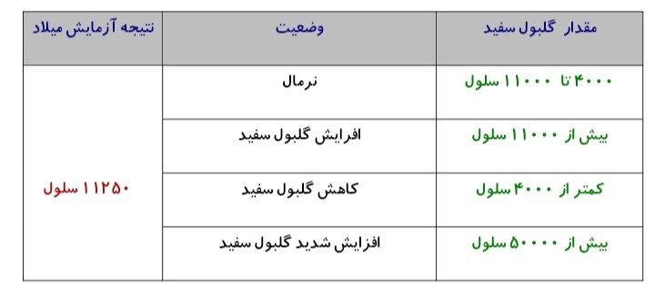 با توجه به برگهی آزمایش خون میلاد، وضعیت گلبولهای سفید او چگونه میباشد؟