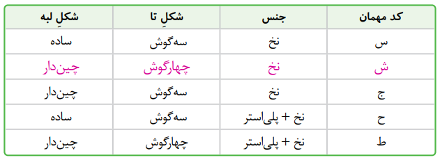 روی یک میز پذیرایی کنار هر بشقاب، کارد و چنگال را به همراه دستمالی قرار دادهاند. از میان پنج دستمال سفره با کدهای «س، ش، ج، ح، ط» سهتا از دستمالها کاملاً نخی هستند و در «ح و ط،» پلیاستر هم به کار رفته است. دستمالهای «ش و ط» به صورت چهارگوش و بقیه به حالت سهگوش تاخوردهاند. لبهی «ح و س» ساده است و بقیه دارای لبههایی چیندار هستند. دستمالی که کنار ظرف پذیرایی دومین مهمان از سمت چپ میز، قرار خواهد گرفت، تای مربع و لبهی چیندار دارد و در آن پلیاستر به کار نرفته است. او چه دستمالی را به دست خواهد گرفت؟