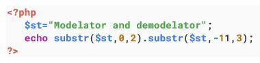 سپس  3  کاراکتر از آنجا به بعد:  "dem"  (اما توجه کنید که ایندکس‌دهی از  0  شروع می‌شود، پس  -10  در واقع به  d  در  "demodelator"  اشاره دارد و  3  کاراکتر بعدی  "dem"  است.)