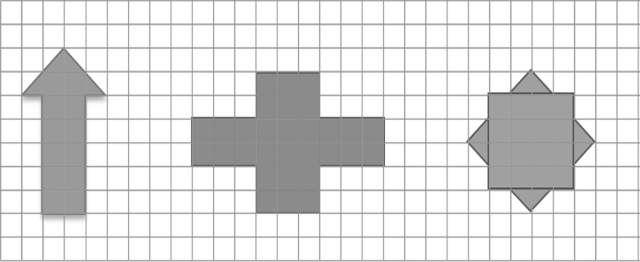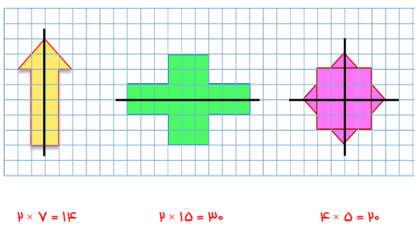 با رسم خط تقارن هر شکل و پیدا کردن مساحت یک قسمت، مساحت کل شکل را به دست آورید.