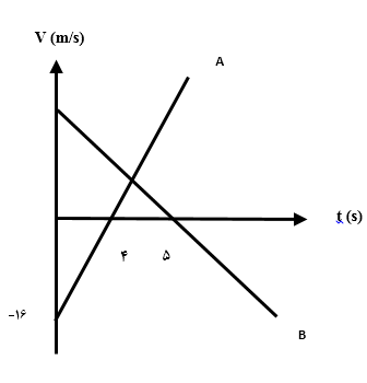 نمودار سرعت-زمان دو متحرک A و B مطابق شکل زیر است. متحرک B ابتدا 10 متر عقبتر از A بوده و در لحظهای که متحرک B تغییر جهت داده متحرک A در ${{x}_{~}}=30m$ بوده است. متحرک B ابتدا در چه نقطهای بوده است؟