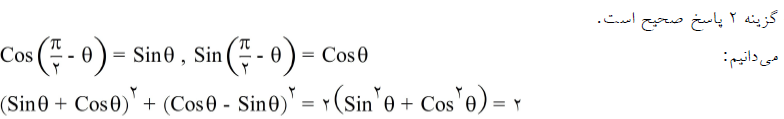 مجموع مربعات دو عبارت $\sin \theta +\sin \left( \frac{\pi }{2}-\theta \right)$ و $\cos \theta -\cos \left( \frac{\pi }{2}-\theta \right)$ کدام است؟