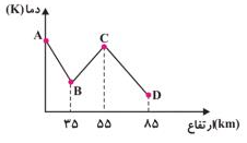 با توجه به نمودار مقابل که تغییرات دمای هواکره برحسب ارتفاع از سطح زمین را نشان میدهد، چه تعداد از عبارتهای زیر درست هستند؟
