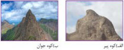 ب) کوه جوان ارتفاع بلندتر و قلهای نوکتیز دارد. همچنین چون فرسایش در آن کمتر روی داده، خاک کمتری در سطح آن قرار دارد و درهها تنگ و V شکل هستند.