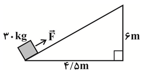 میخواهیم جعبهای به جرم 30 کیلوگرم را به کمک سطح شیبدار زیر تا ارتفاع 6 متری بالا ببریم، با چه نیرویی بر حسب نیوتون موازی با سطح شیبدار، جعبه را روی سطح شیبدار بالا بکشیم تا جعبه با تندی ثابت حرکت کند؟ (از اصطکاک صرفنظر کنید و$\left(g=10 \frac{\mathrm{~m}}{\mathrm{~s}^2}\right.$