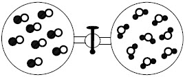 اگر دو ظرف در بستهٔ متصل به یکدیگر، مطابق شکل زیر، هر یک با حجم یک لیتر، یکی دارای گاز $CO$ و دیگری بخار ${H_2}O$ آماده شده، سپس شیر میان آنها باز شود تا با هم مخلوط شوند و در شرایط مناسب، واکنش تعادلی: $K = 9$ ، $CO(g) + {H_2}O(g) \rightleftharpoons C{O_2}(g) + {H_2}(g)$، انجام شود، مقدار گاز ${H_2}$ در مخلوط تعادلی، برابر چند مول است؟ (هر ذره همارز 0/025 مول در نظر گرفته شود.)