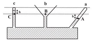 ظرفهای مرتبط شکل زیر را در هوای آزاد قرار میدهیم و درون آن آب میریزیم. مشاهده میکنیم سطح آب در ظرفهای مختلف مانند شکل، بالا میآید. کدام گزینه مقایسهء فشار در نقاط C و B ،A را به درستی نشان میدهد؟