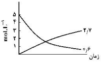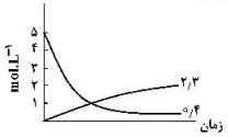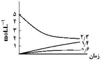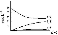 اگر واکنش تعادلی: $2NO(g) \rightleftharpoons {N_2}(g) + {O_2}(g)\,,\,K = 49$، در یک ظرف دو لیتری، با 10 مول $NO(g)$ در شرایط مناسب آغاز شود، کدام نمودار نشاندهندهٔ روند تقریبی تغییر غلظت مواد تا برقرار شدن حالت تعادل است؟