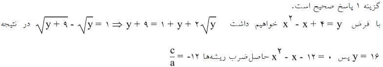 در معادله رادیکالی $\sqrt{{{x}^{2}}-x+13}-\sqrt{{{x}^{2}}-x+4}=1$ حاصل ضرب ریشهها کدام است؟
