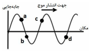 شکل روبهرو یک موج سینوسی را در لحظهای از زمان نشان میدهد که در جهت محور x در طول ریسمان کشیده شدهای حرکت میکند. چهار جزء از این ریسمان روی شکل نشان داده شدهاند. نام اجزایی که در این مکان لحظه، به طرف پایین میروند را بنویسید.