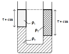 در شکل زیر، سه مایع مخلوط نشدنی با چگالیهای ${\rho _1}$ و ${\rho _2}$ و ${\rho _3}$ به حال تعادل قرار دارند. اگر ${\rho _2} = 2{\rho _1}$ باشد، نسبت $\frac{{{\rho _3}}}{{{\rho _1}}}$ چقدر است؟