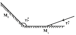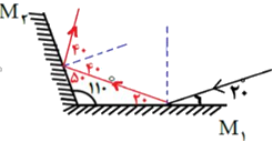 در شکل زیر، پرتوهای بازتابیده از آینههای ${M_1}$ و ${M_2}$ را رسم کنید و زاویه تابش و بازتاب آینه ${M_2}$ را مشخص کنید.