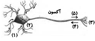 با توجه به شکل زیر، محل وجود هستة یاخته، محل تجمع بیشتر اندامکها و جهت هدایت پیام عصبی در طول آکسون بهترتیب کدام است؟
