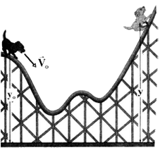 در شکل زیر، سگی روی سطح بدون اصطکاک از ارتفاع ${y_0} = 2/6m$ با تندی اولیهٔ ${V_0}$ شروع به حرکت کرده و در ارتفاع $y = 3/4m$ بهطور موقت متوقف میشود. ${V_0}$ چند متر بر ثانیه است؟$(g = 10\frac{m}{{{s^2}}})$