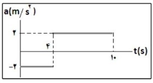 نمودار شتاب - زمان متحرکی که در امتداد محور حرکت میکند، مطابق شکل است. در صورتی که سرعت متحرک در لحظه 8 ثانیه برابر با 2+ متر بر ثانیه باشد، مسافت طی شده از لحظه صفر تا 10 ثانیه چقدر است؟