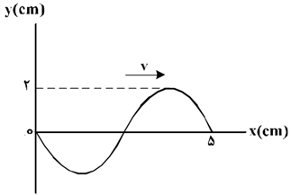 نقش یک موج عرضی که در یک طناب با سرعت $20\frac{cm}{s}$ در حال انتشار است، مطابق شکل زیر است. مسافتی که یک ذره از طناب در مدت $\frac{1}{8}s$ طی میکند، چند سانتیمتر است؟