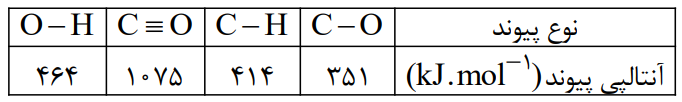با توجه به دادههای جدول زیر هرگاه در واکنش$( g ) HO _3 HC \rightarrow( g )_2 H ^2+( g ) OC$به ازای مصرف0/6مول گاز مقدار 22 کیلوژول گرما آزاد شود، تفاوت آنتالپی پیوند در مولکولهای هیدروژن و کربن مونوکسید کدام است؟