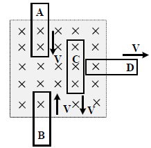در شکل زیر، میدان مغناطیسی یکنواخت درونسو در محدودهٔ مشخص شده برقرار است و حلقههای رسانا در جهت نشانداده شده حرکت میکنند. در کدام حلقه، جهت جریان القایی ساعتگرد است؟