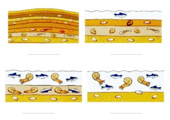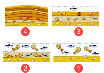 شکلهای زیر مراحل تشکیل فسیل را نشان میدهند. آنها را به ترتیب شمارهگذاری کنید.