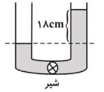 مطابق شکل زیر، قسمت پایین لولهی U شکلی را که با آب پُر شده است، توسط شیر بستهایم. اگر شیر را به طور کامل باز کنیم، بعد از ایجاد تعادل، مایع درون سمت چپ لوله چند سانتیمتر بالا میرود؟