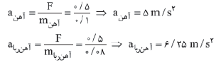 در لحظهی نشان داده شده در شکل روبهرو، آهنربا، آهن را با نیروی $0/5N$ به طرف خودش میکشد. در این لحظه شتاب حرکت آهن و آهنربا بهترتیب چند متر بر مجذور ثانیه است؟ (از اصطکاک چشمپوشی کنید.)