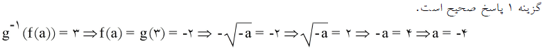 \end{matrix} \right.$ و $g=\left\{ (2,-1)\,,\,(-1,4)\,,\,(3,-2)\,,(-4,-3) \right\}$ مفروضاند. اگر ${{g}^{-1}}(f(a))=3$ باشد، $a$ کدام است؟