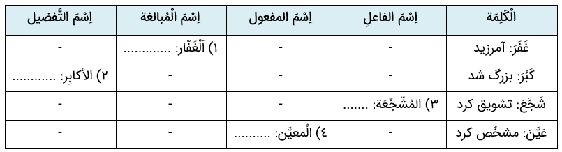 تَرجِمِ اسمَ الفاعِل و اسمِ المفعول و اسمَ المُبالغة و اسمَ التَّفضیل: