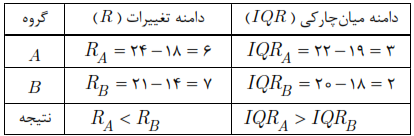 الف) پراکندگی دو گروه را با استفاده از دامنهٔ تغییرات و دامنهٔ میان چارکی مقایسه کنید.