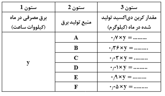 با توجه به جدول زیر به ازای مصرف 500 کیلووات ساعت برق در هر ماه برای کارگاه (الف) و به ازای مصرف 1500 کیلووات ساعت برق ماهیانه کارگاه (ب) مجموع کربن دیاکسید تولید شده در یک سال برای هر دو کارگاه برابر چند کیلوگرم میباشد؟ (منبع تولید برق کارگاه (الف) و (ب) به ترتیب انرژی خورشید و گاز طبیعی میباشد.)