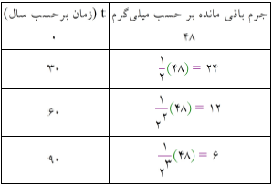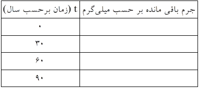 نیمه عمر یک نوع ماده هستهای حدود 30 سال است. اگر جرم نمونهای از این ماده، 48 میلی گرم باشد، جدول زیر را کامل کنید.