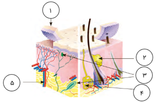شکل زیر ساختمان پوست را نشان میدهد. کدام شمارهها به ترتیب غده عرق و غده چربی را نشان میدهند؟