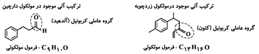 مولكولی كه طعم و بوی دارچين به طور عمده به آن وابسته است دارای گروه عاملی . . . و فرمول مولكولی . . . است، همچنين مولكولی كه طعم و بوی زردچوبه به طور عمده به آن وابسته است دارای گروه عاملی . . . و فرمول مولكولی . . . است.