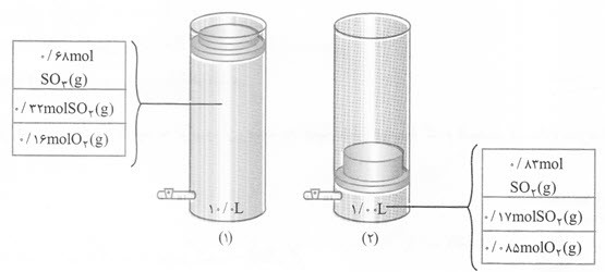 شکل زیر، به تعادل $2S{{O}_{2}}(g)+{{O}_{2}}(g)\rightleftharpoons 2S{{O}_{3}}(g),K=2/8\times {{10}^{2}}mo{{l}^{-1}}.L$ در دمای ${{727}^{\circ }}C$ مربوط است.