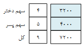 پدری میخواهد 7200 تومان را به نسبت 4 به 5 بین دختر و پسرش تقسیم کند سهم هر کدام چند تومان است؟