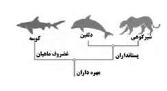 بین کدام جانوران مشخص شده در تصویر زیر، بیشترین توالیهای حفظ شده در ساختار دنا مشاهده میشود؟
