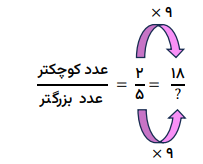 نسبت دو عدد ${2 \over 5} $ است. اگر عدد کوچکتر 18 باشد، عدد بزرگتر چند است؟