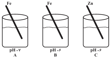 با توجه به شکل روبهرو که حالتهای مختلف قرارگیری فلزها را در ظرفهای حاوی محلولهای متفاوت با دمای $C^{\circ} 25$ نشان میدهد، کدام گزینه ترتیب شدت خوردگی فلزها را به درستی نشان میدهد؟