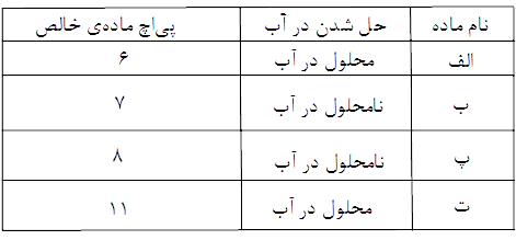 جدول زیر اطلاعاتی مربوط به چهار مادهی مختلف را در اختیار قرار میدهد. یکی از مشکلاتی که فاضلاب خروجی از کارخانههای کاغذسازی برای محیط زیست ایجاد میکند، اسیدی یا بازی کردن و تغییر پیاچ آب و خاک است. فرض کنید استفاده از موادی مانند جوهر نمک در کارخانه موجب تغییر پیاچ فاضلاب خروجی و در نتیجه خاک شده است، برای کاهش مشکل ایجاد شده در خاک و برای کاهش آسیب به جانداران خاکزی افزودن کدامیک از موادّ زیر را به خاک پیشنهاد میکنید؟