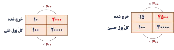 علی 20000 تومان و حسین 30000 تومان پول دارند. اگر علی $10\% $ و حسین $15\% $ از پولشان را خرج کنند: