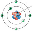 شکل زیر مدل بور اتمی که در هسته آن 4 پروتون و 5 نوترون قرار داشته و در حالت یونی قرار دارد را نشان میدهد.