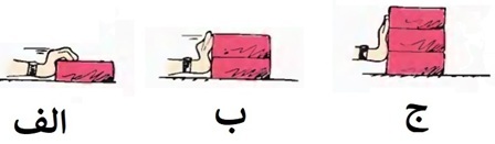در شکل زیر، یک دست با نیروی ثابت F به ترتیب یک، دو و سه آجر را روی یک سطح افقی بدون اصطکاک هل میدهد. جرم هر آجر m است. کدام گزینه دربارهٔ شتاب آجرها صحیح است؟