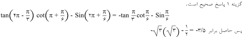 حاصل $\tan \left( \frac{11\pi }{3} \right)\cot \left( \frac{7\pi }{6} \right)-\sin \frac{13\pi }{6}$ کدام است؟