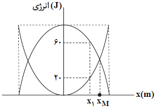 شكل زير، انرژیهای پتانسيل و جنبشی نوسانگری به جرم $200g$ كه حركت هماهنگ ساده دارد را برحسب مكان نشان میدهد. تندی اين نوسانگر هنگام عبور از مكان ${{x}_{M}}$ چند متربرثانيه است؟