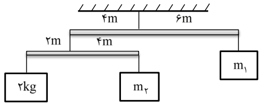 اگر هر دو میله شکل زیر در حالت تعادل و افقی باشند و مجموعه را از سقف آویخته باشیم، وزنه m1 چند کیلوگرم است؟ (از جرم میلهها و نخها صرفنظر شود).