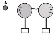 در شکل زیر کرههای فلزی که ابتدا خنثی هستند، توسط یک سیم رسانا با هم در ارتباطند. با نزدیک کردن جسم A دو کره به صورت شکل زیر باردار می شوند. در رابطه با رسانایی جسم A و نوع بار آن، کدام گزینه درست است؟