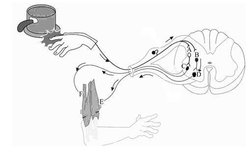 با توجه به شکل زیر و به دنبال برخورد انگشت دست به جسم داغ و انجام انعکاس عقب کشیدن دست؛ به سوالات زیر پاسخ دهید.