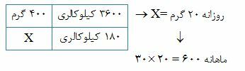 اگر به طور میانگین به ازای هر 3600 کیلوکالری انرژی که بیش از نیاز بدن دریافت میشود، 400 گرم به وزن بدن اضافه گردد؛ محاسبه کنید فردی که روزانه 180 کیلوکالری بیش از نیاز خود انرژی دریافت میکند و تغییری هم در رژیم غذایی و یا نوع فعالیت بدنی خود ایجاد نکرده است، افزایش وزن روزانه و ماهانه وی چند گرم خواهد بود؟ (نوشتن راه حل الزامی است)