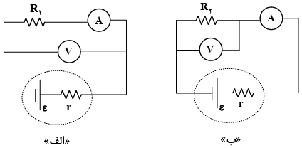 در مدارهای شکل زیر، مقاومت آمپرسنج و ولتسنج، بهترتیب $5\Omega $ و $180\Omega $ است. اگر در مدار «الف» آمپرسنج 1/6A و ولتسنج 72V را نشان دهد و در مدار «ب» آمپرسنج 0/82A و ولتسنج 73/8V را نشان دهد، ${R_1}$ و ${R_2}$ چند اُهم هستند؟