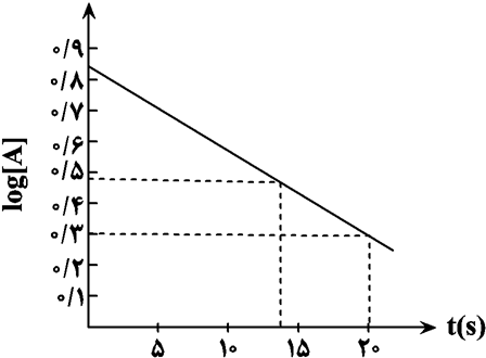 $\begin{array}{r}t=0 \rightarrow \log [A]=0 / 85 \Rightarrow[A]=10^{0 / 85}=7 \mathrm{~mol} \cdot \mathrm{~L}^{-1} \\ t=13 S \rightarrow \log [A]=0 / 48 \Rightarrow[A]=10^{0 / 48}=3 \mathrm{~mol} \cdot \mathrm{~L}^{-1} \\ t=20 S \rightarrow \log [A]=0 / 3 \Rightarrow[A]=10^{0 / 3}=2 \mathrm{~mol} \cdot \mathrm{~L}^{-1} \\ R, \text { s } \square=\frac{\overline{R A}}{2}=-\frac{\Delta[A]}{2 \Delta t}=\frac{7-2}{2 \times 20}=\frac{5}{40} \mathrm{~mol} \cdot \mathrm{~L}^{-1} \cdot \mathrm{~s}^{-1} \\ R_A=\frac{\Delta[A]}{\Delta t}=\frac{3-2}{7}=\frac{1}{7} \mathrm{~mol} \cdot \mathrm{~L}^{-1} \cdot \mathrm{~s}^{-1}\end{array}$